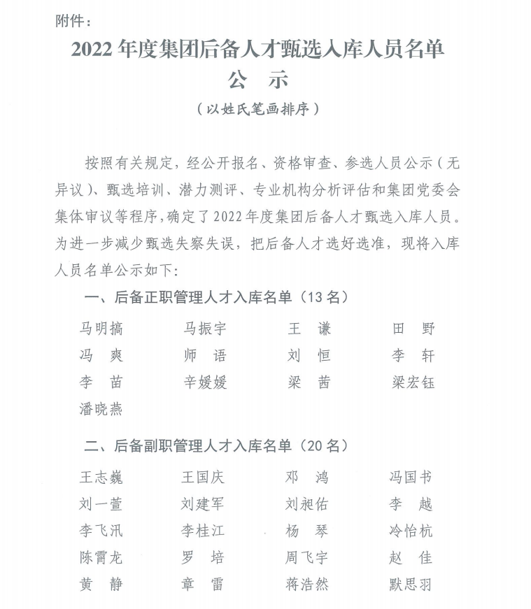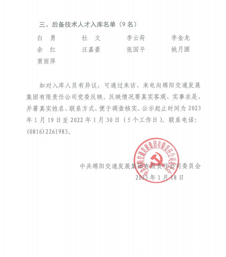 中共綿陽交通發(fā)展集團(tuán)有限責(zé)任公司委員會關(guān)于印發(fā)《2022年度集團(tuán)后備人才甄選人庫人員名單公示》的通知