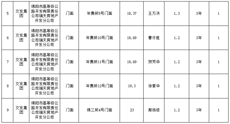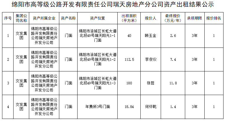 綿陽市高等級公路開發(fā)有限責任公司瑞天房地產(chǎn)分公司資產(chǎn)出租結果公示