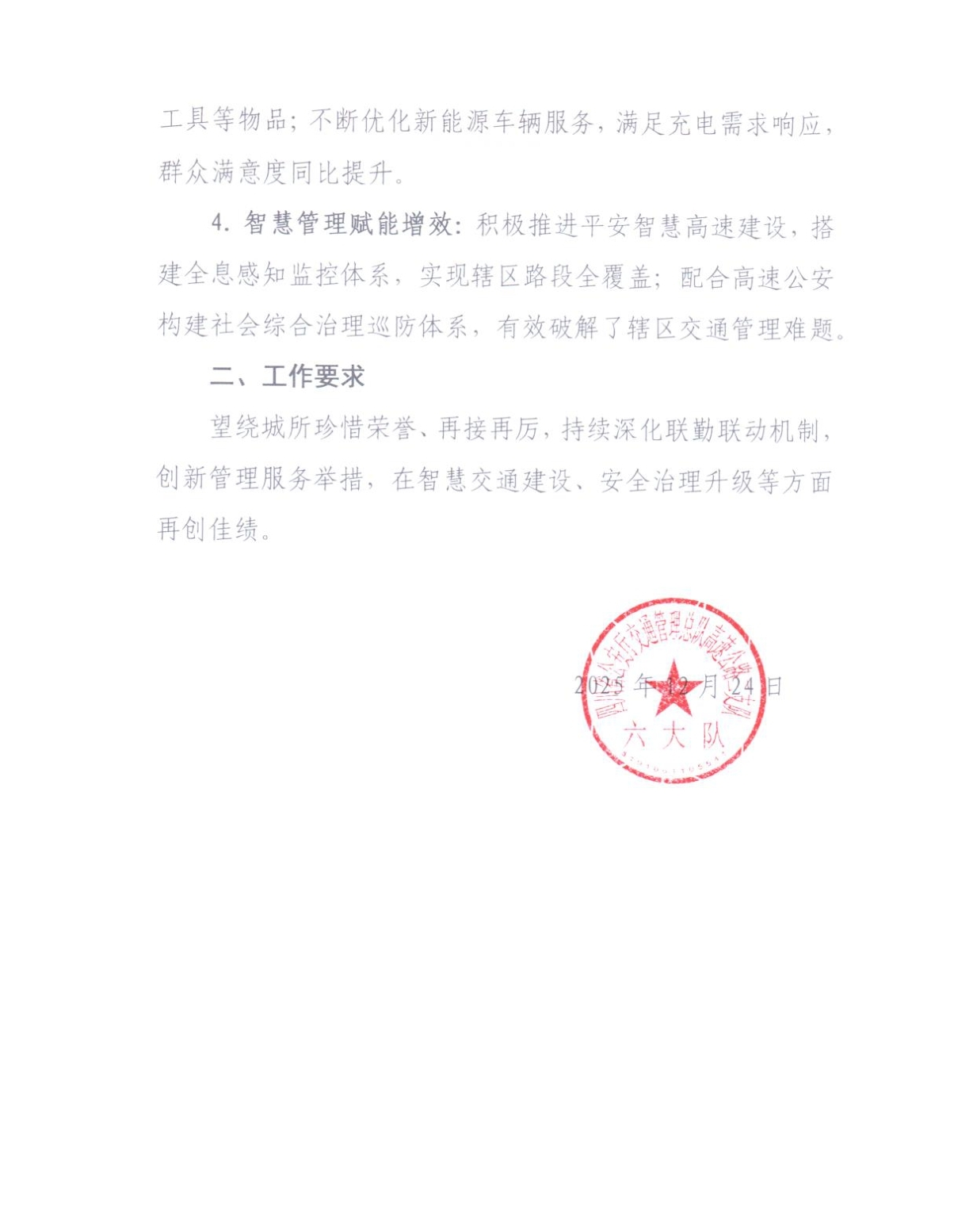 1月15日,高開司收到來自四川省公安廳交通管理總隊高速公路二支隊六大隊的一封感謝信。信中對高開司繞城高速2025年度“安全暢通、優(yōu)質(zhì)服務(wù)、智慧升級”核心目標(biāo),深度踐行“一路三方”聯(lián)勤聯(lián)動與“五崗合一”工作機制,在轄區(qū)高速公路安全防控、保通保暢、服務(wù)提質(zhì)、科技賦能等工作中成效顯著,全年未發(fā)生一般程序道路交通事故,為區(qū)域高速公路管理樹立了先進(jìn)標(biāo)桿,給予高度贊譽,對公司與高速公安攜手筑牢道路安全防線、全力保障公眾出行順暢的堅實舉措表達(dá)誠摯謝意,字里行間滿含認(rèn)可與期許。